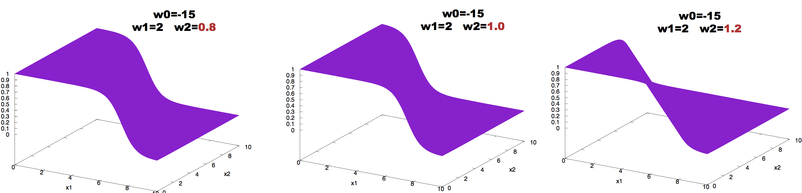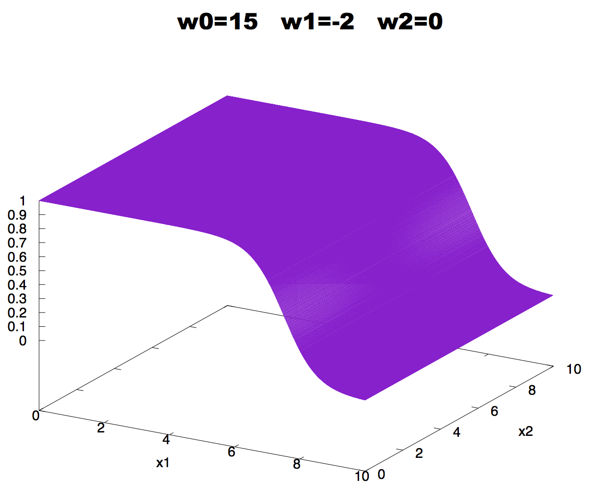 \[y(\mathbf{w},\mathbf{x}) =\frac{1}{1+e^{-(w_0+w_1 x_1 + w_2 x_2)}}.\]