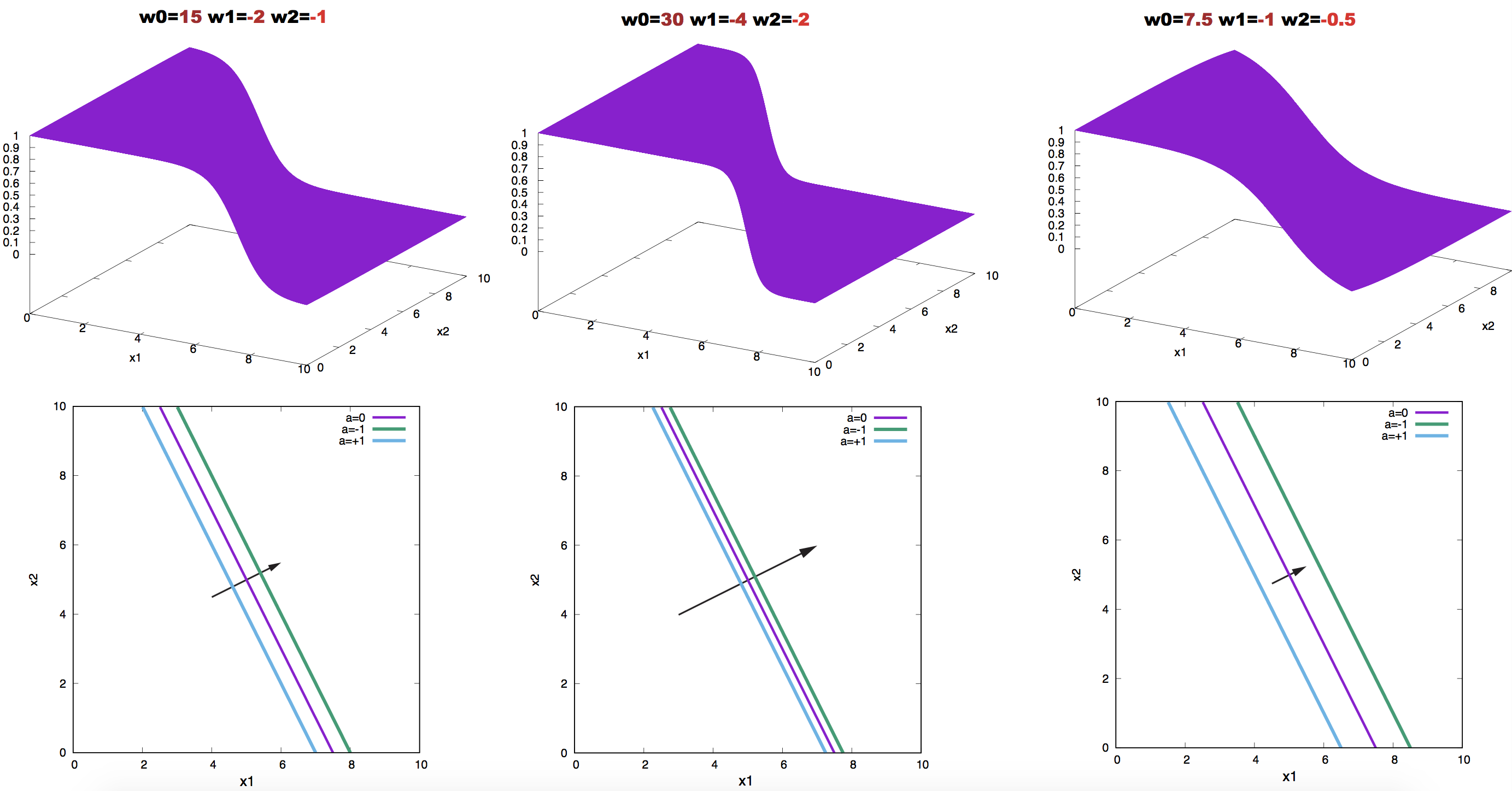 Consider the simple situation of only two input to the neuron \(\mathbf{x}=(x_1, x_2)\), and only two weights \(\mathbf{w}=(w_1, w_2)\) and no bias. The neuron’s activation is given by