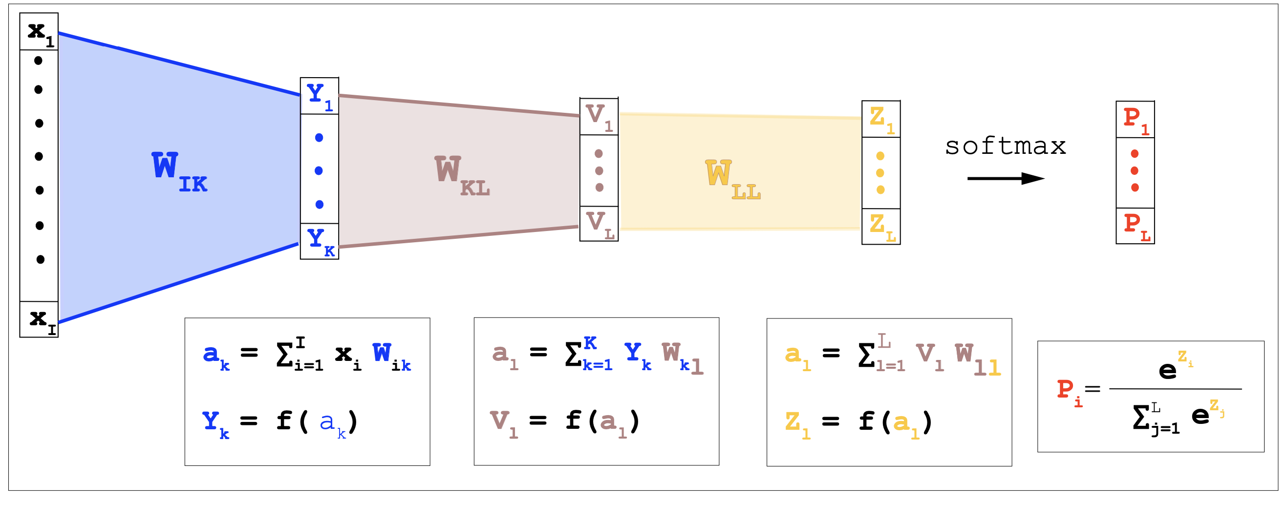 \[L(W^1, b^1, W^2, b^2) = - \frac{1}{N}\sum_{n=1}^N \sum_{o=1}^O t^{(n)}_o \log y^{(n)}_o.\]The predicted outcomes \(y^{(n)}_o\) depend on all the weight parameters \(W^1, b^1, W^2, b^2\) as described in Figure 3.