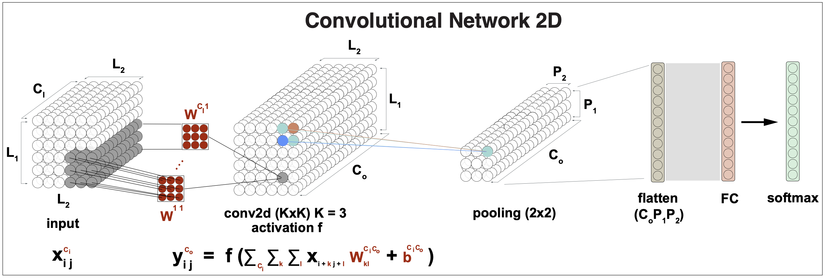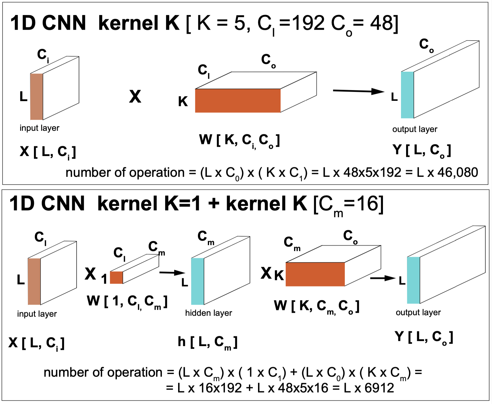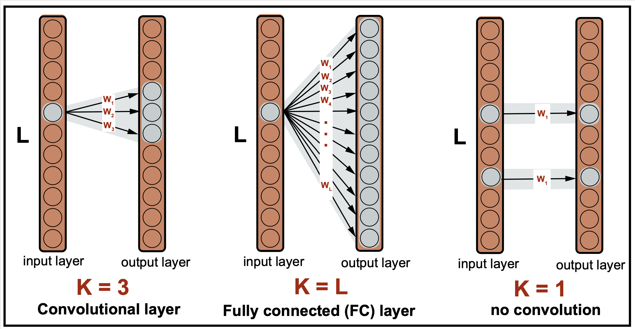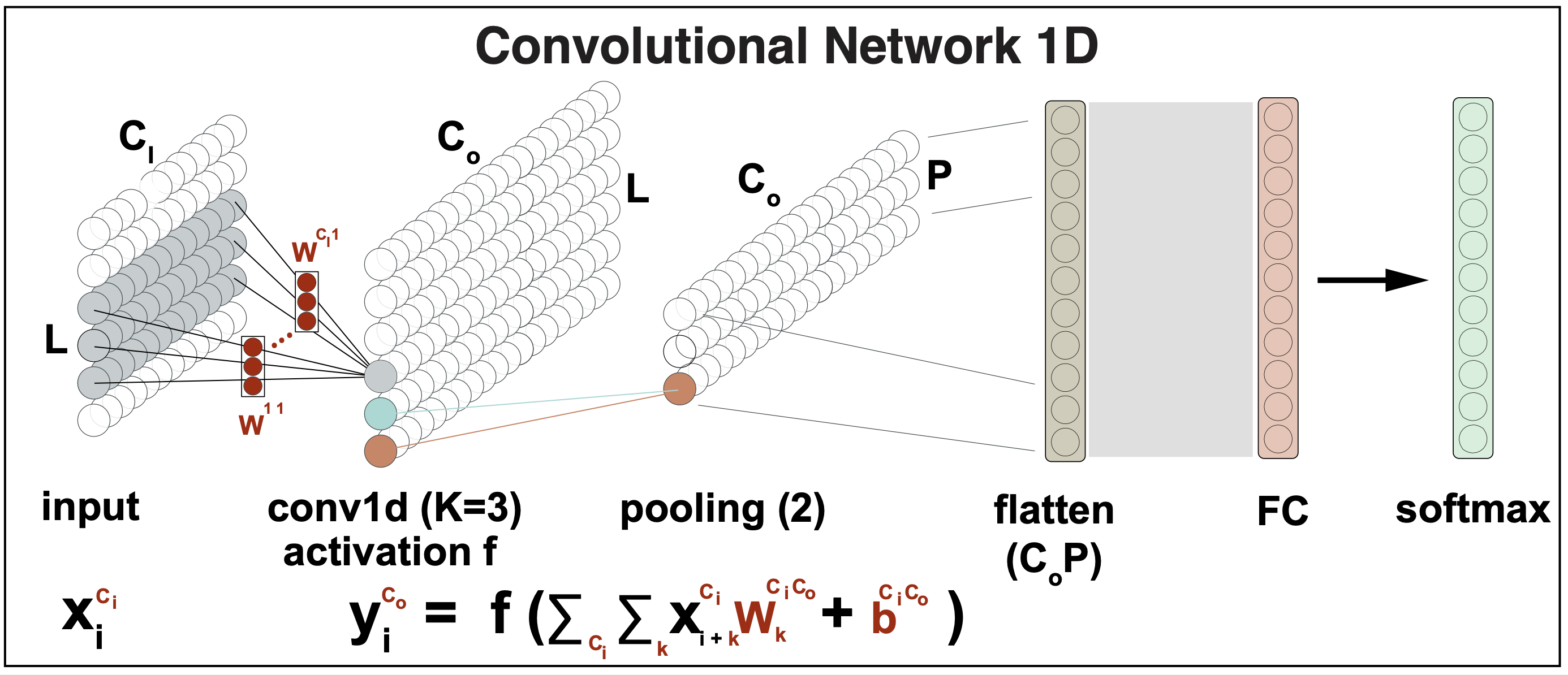 \[y^{c_o}_i = f\left(\beta^{c_o} + \sum_{k=1}^3 x_{i+k-2} W^{c_o}_k\right)\quad for\, 1\leq c_o \leq C_o\]Moreover, the inputs can also have many layers \(C_I\), then the hidden units in each output channel are computed as a weighted sum over all \(C_i\) channels and K kernel entries using a weight matrix \(W[K,C_I]\).