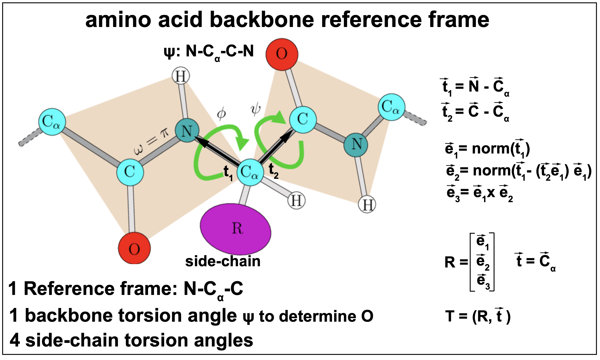 Each amino acid is then characterized by a rotation which is a matrix \(R[3,3]\), and a translation \(\bar{t}[3]\) that describe the 3D locations for the backbone \(C_{\alpha}\), C and N atoms. Together they are referred to as a Euclidean transformation.