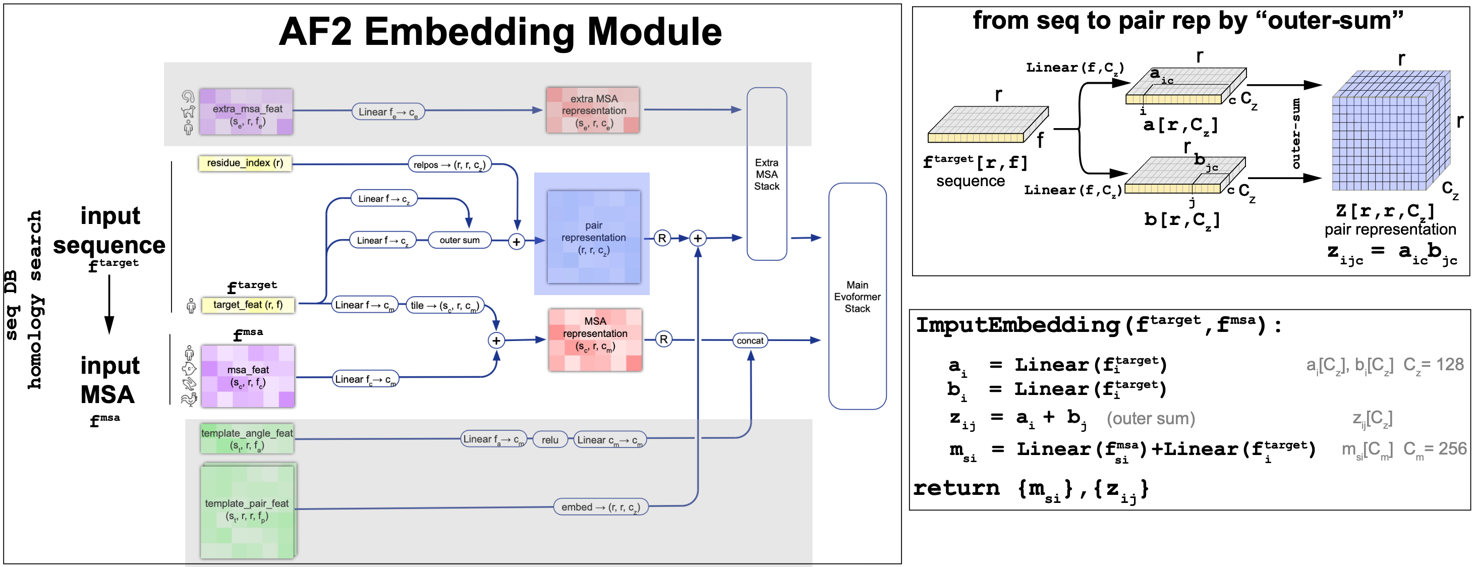 The embedding module is described in Figure 11. Figure 11 concentrates on the description of the embedding of the sequence and the MSA into the pair and MSA representations. For more information about how to add templates and the extra MSAs please refer to the AF2 supplement.
