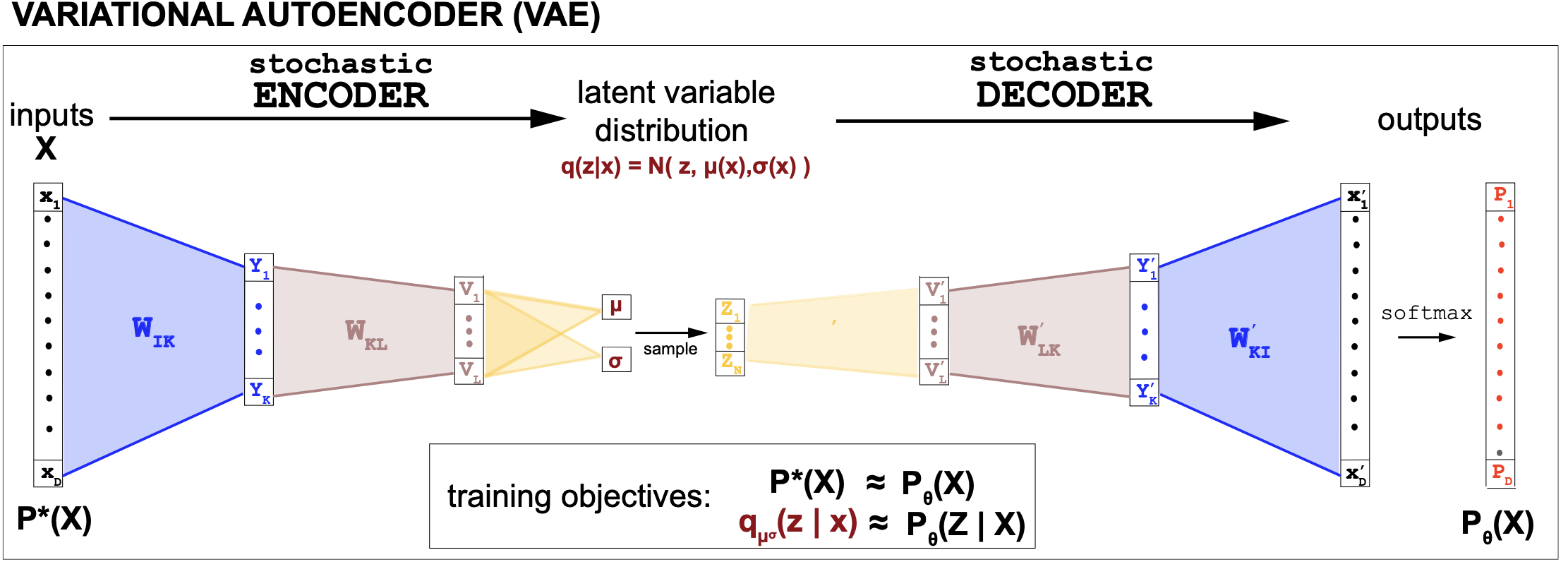 Figure 9. Description of a VAE where we assume that the generative distribution (decoder) is a categorical variable, and the variational discriminative distribution is an normal distribution where the parameters mu and log(sigma) are trained by the encoder.