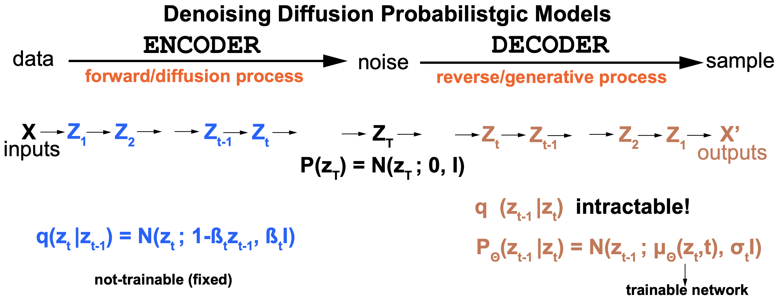 \[p_{\theta}(z_{t-1}\mid z_t) = N(z_{t-1}; \mu_{\theta}(z_t,t), I)\]where the Normal distribution’s mean \(\mu_{\theta}(z_t,t)\) is trained by some deep learning method.