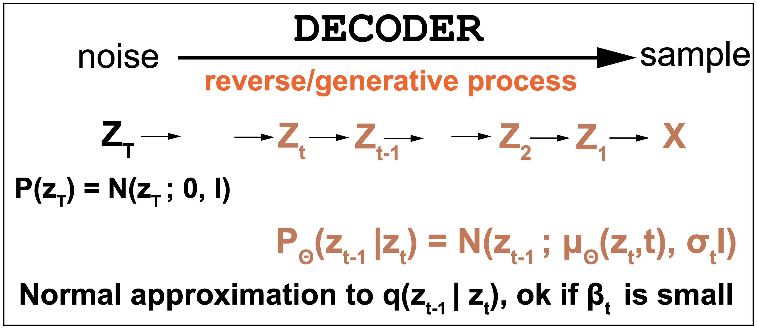 \[q(z_{t-1}\mid z_t) = \frac{q(z_{t}\mid z_{t-1}) q(z_{t-1})}{q(z_t)}\]This distribution is usually intractable, and in the decoder we approximate it by a Normal distribution \(P_{\theta}(z_{t-1}\mid z_t)\) which depends on parameters \(\theta\). The approximation by a Normal distribution is appropriate for small values of \(\beta_t\).