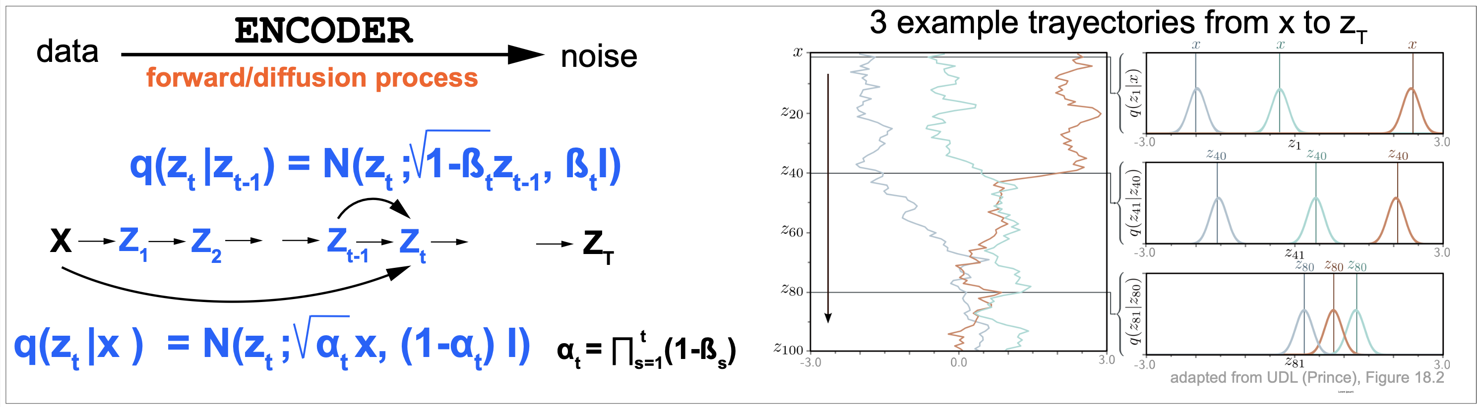 \[P(z_t\mid x) = N(z_t; \sqrt{\alpha_t}\, x, (1-\alpha_t)\, I)\]for \(\alpha_t = \prod_{s=1}^t (1-\beta_s)\).