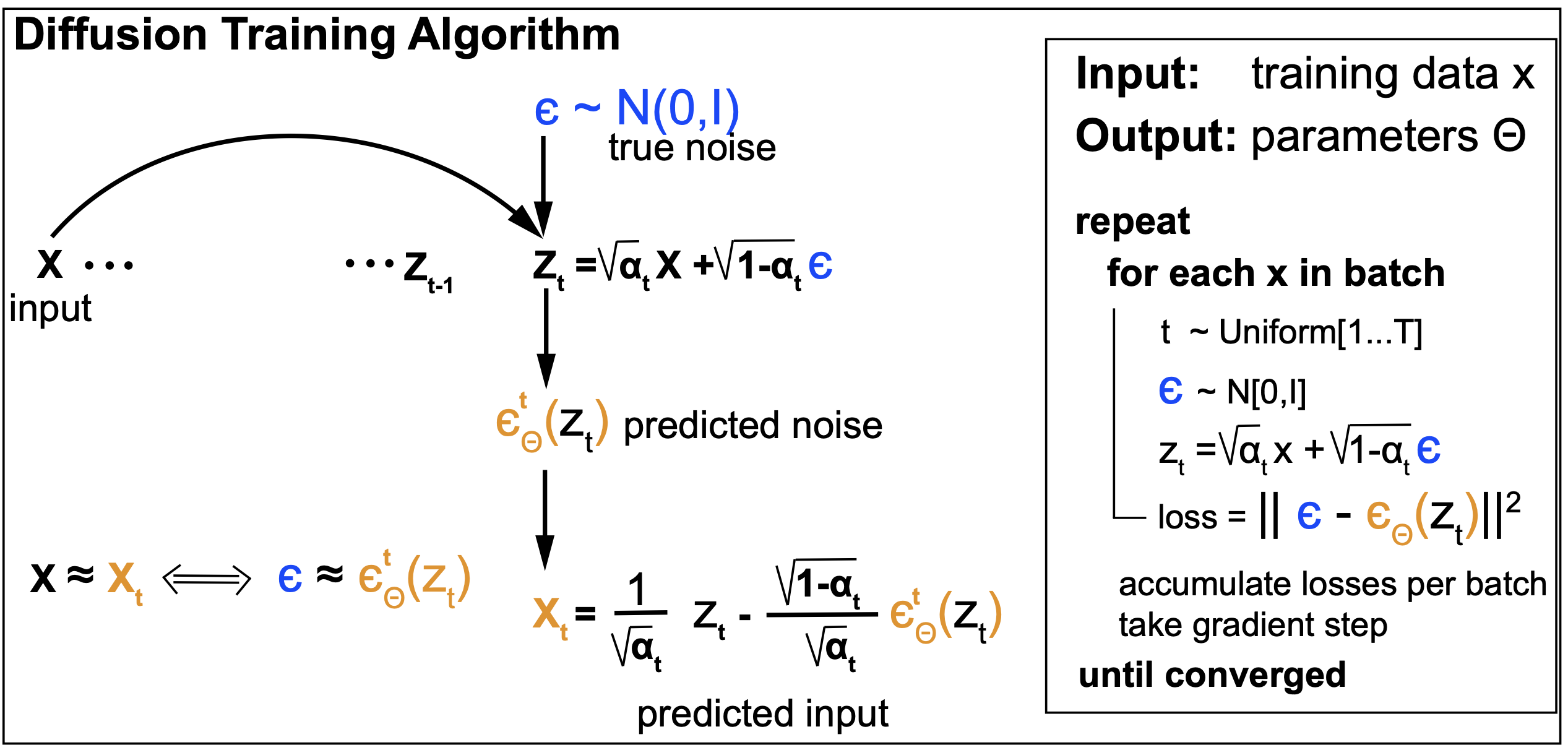 \[\begin{aligned} L_t &= E_q \left[ || \epsilon - \epsilon_{\theta}(z_t,t) ||^2 \right]\\ &= E_q \left[ || \epsilon - \epsilon_{\theta}(\sqrt{\alpha_t}\,x+\sqrt{(1-\alpha_t)}\,\epsilon,t) ||^2 \right]\\ \end{aligned}\]Implementation: