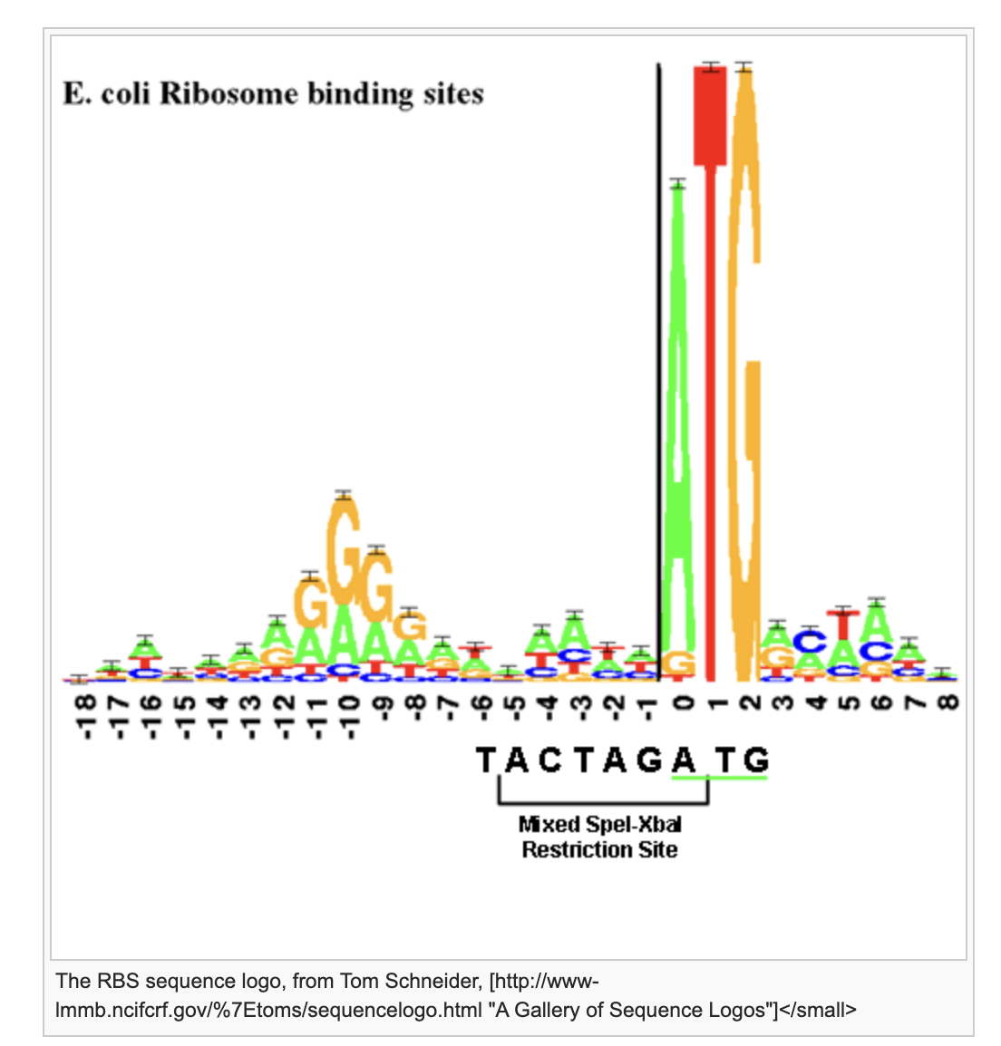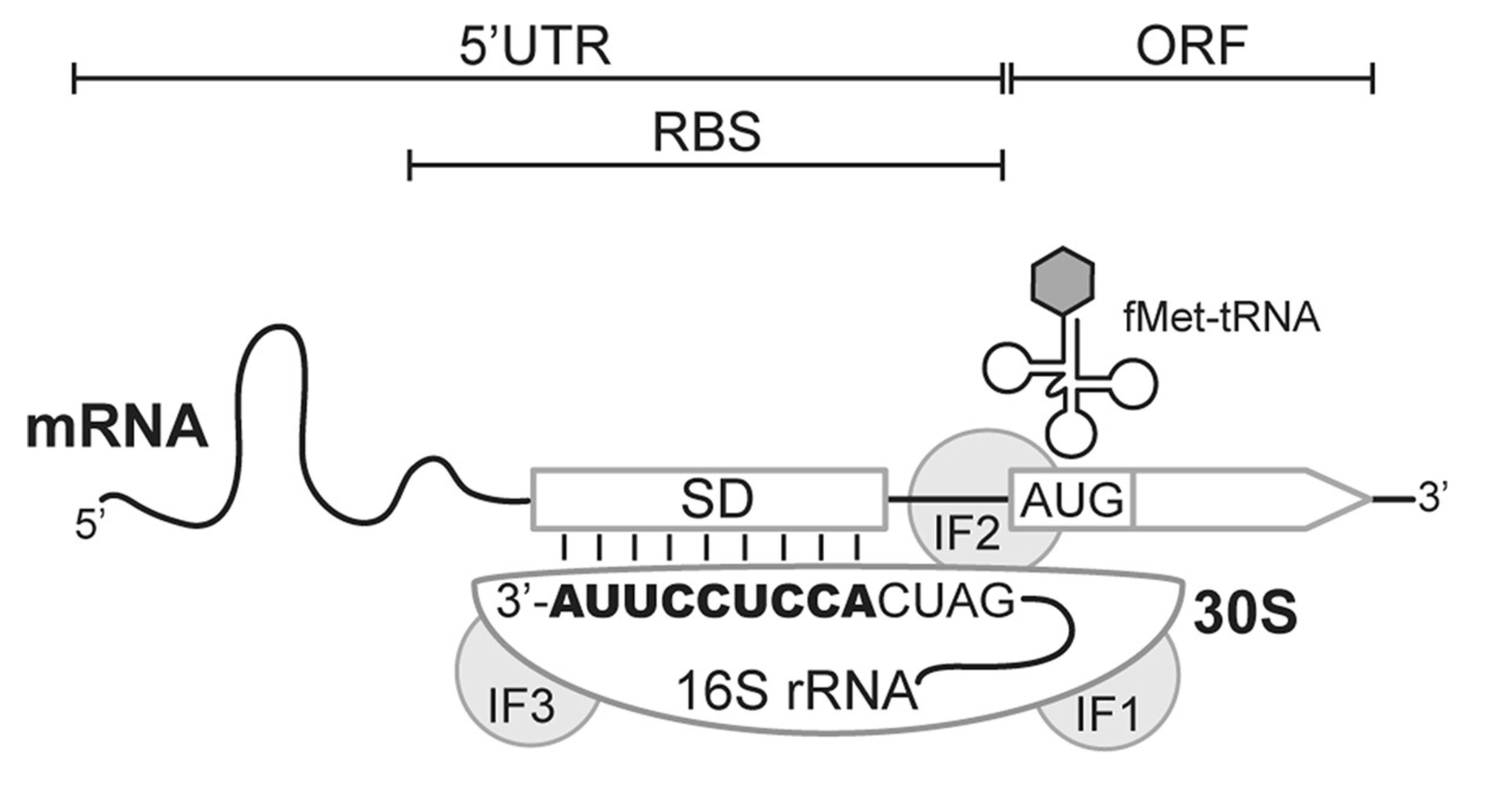 In bacteria, Ribosome Binding Sites (RBS) are specific regions where translation initiates (Figure 14). Ribosome binding sites are characterized by a number of features, most importantly the start codon (AUG) and the Shine-Dalgarno sequence.