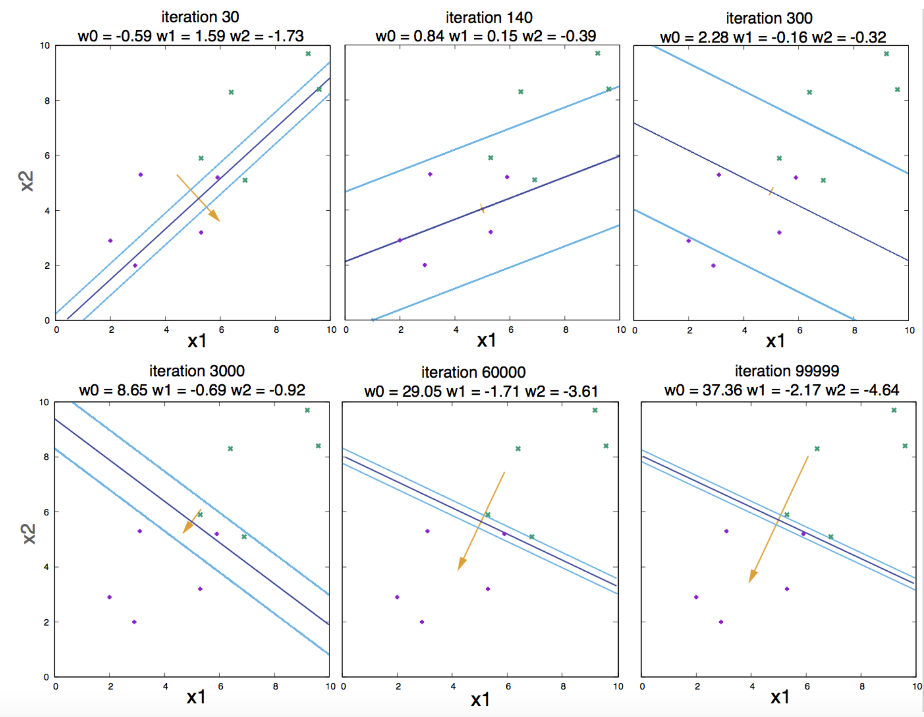Then we can implement a “gradient descent” method in which we iteratively update the weights by a quantity \(\eta\) in the opposite direction to the gradient,