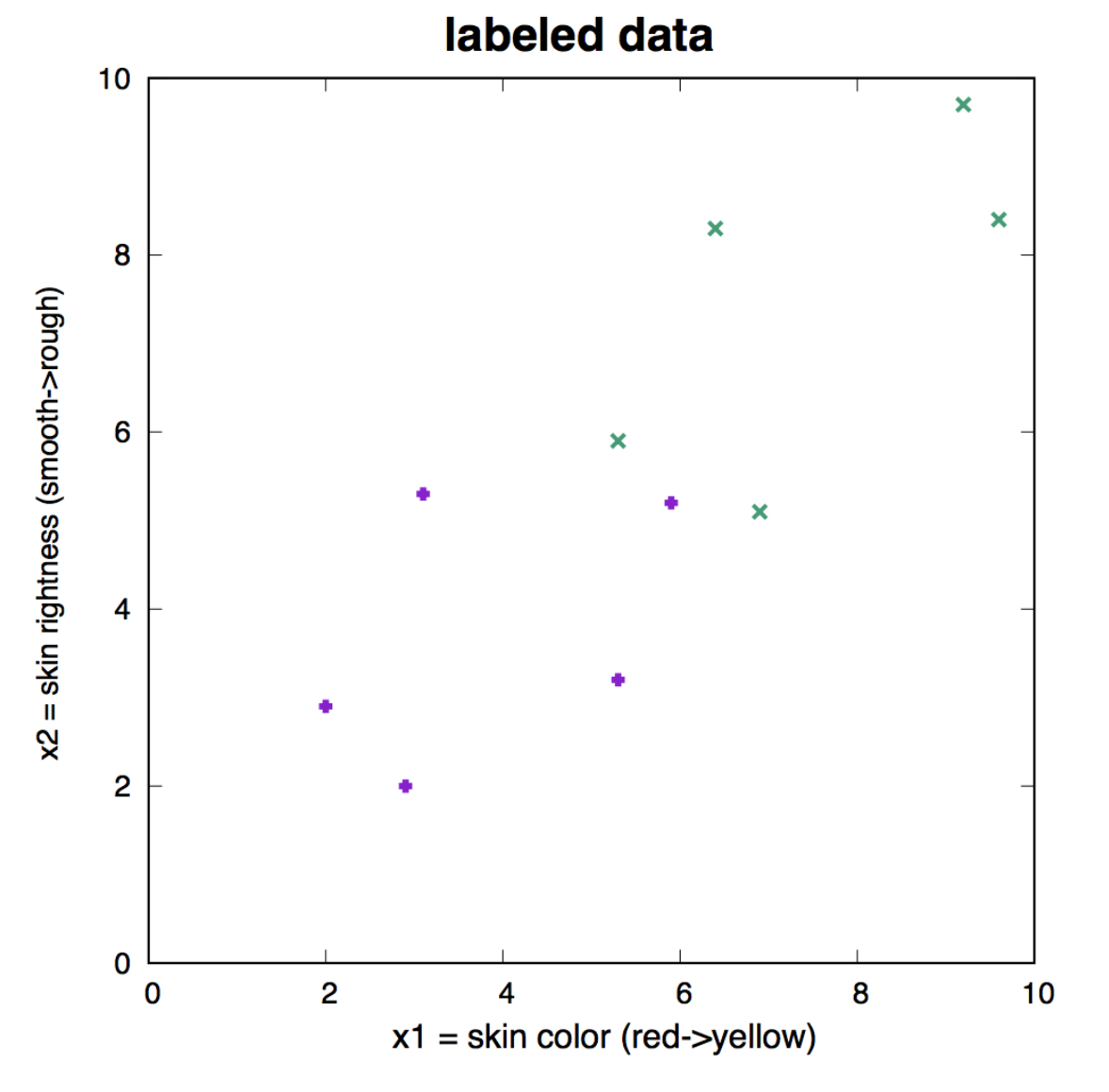The data given in Figure 9 is a collection of 5 apples and 5 oranges, for which we have two types of data (two inputs): color and roughness.