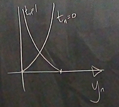 Figure 8. Contribution to the error function G(w) for one data point as a function of y(n) for the two possible cases t(n)=0 and t(n)=1. (From D. Mackay's video lecture 15.)