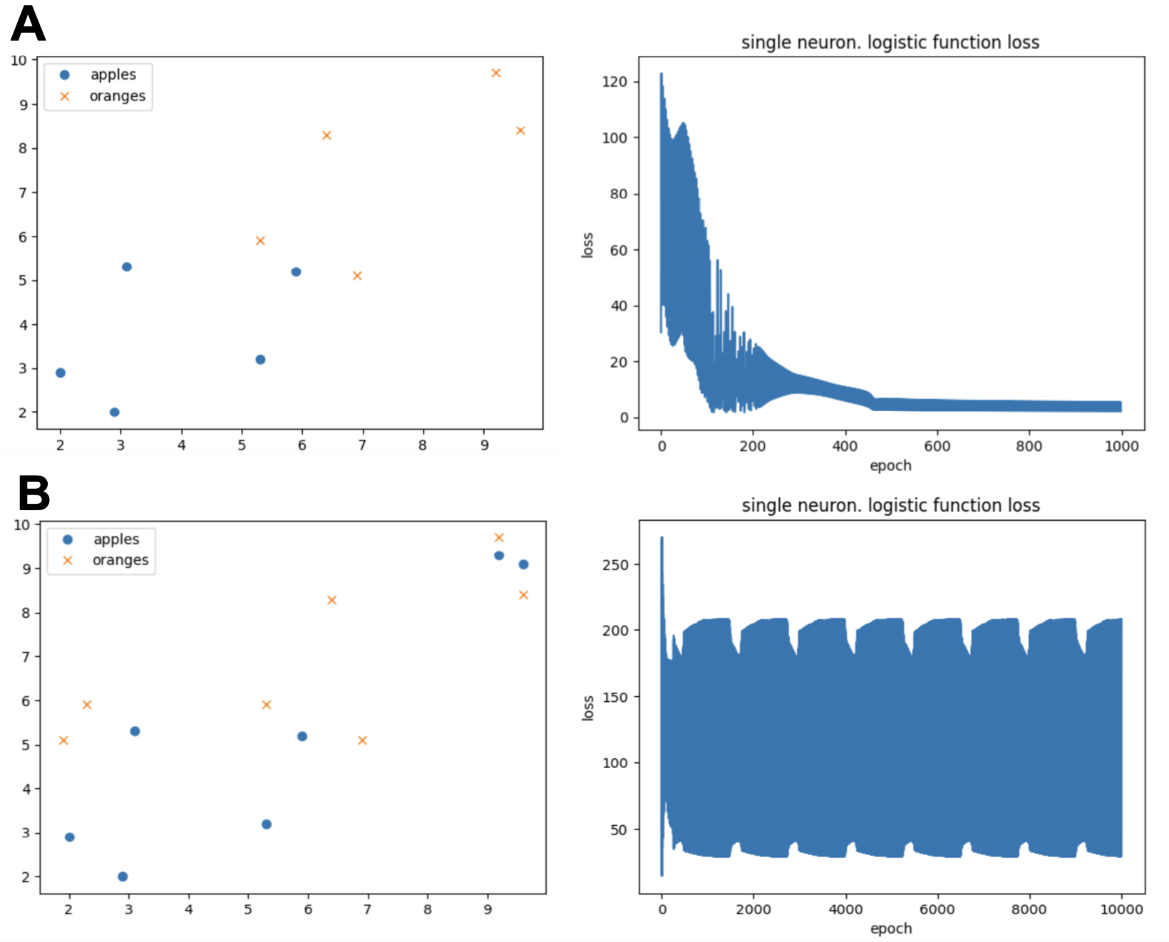 In our previous example, the set of oranges and apples were clearly separable Figure 13a, now consider another case in which the data looks like in Figure 13b. We observe that the data cannot be separated linearly, and as a results the loss function does not converge.