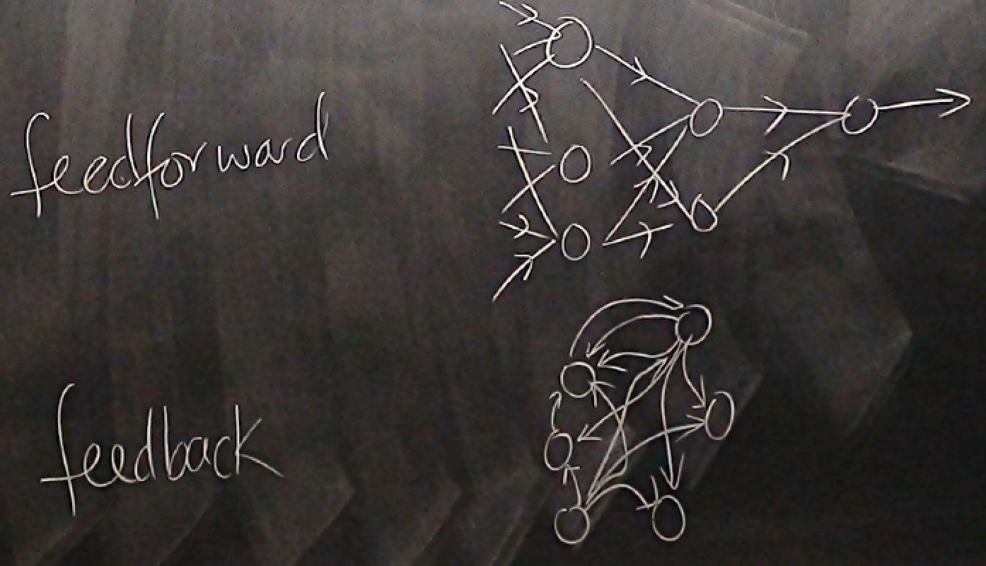 Depending in how we combine many single neurons, there is essentially two types of networks: feedforward networks, where all the information flows in one direction, and feedback networks where all nodes are connected (Figure 2).