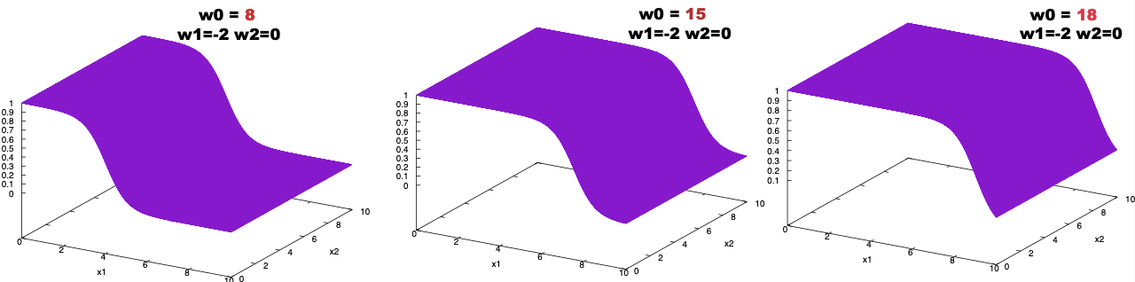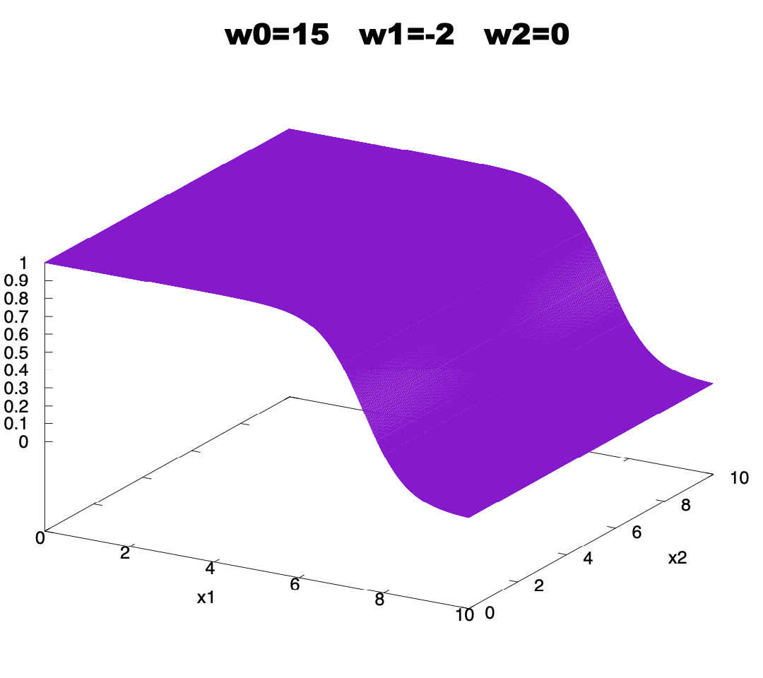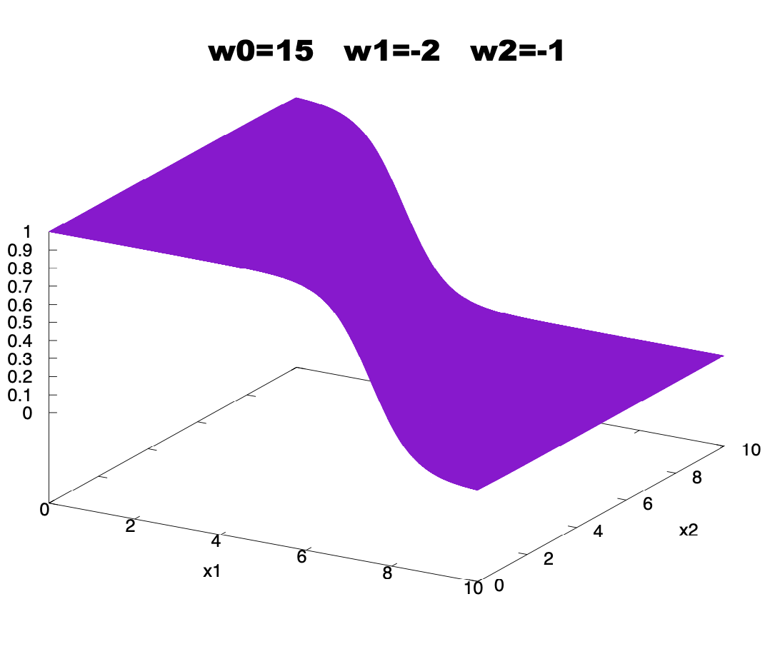 \[y(\mathbf{w},\mathbf{x}) =\frac{1}{1+e^{-(w_0+w_1 x_1 + w_2 x_2)}}.\]