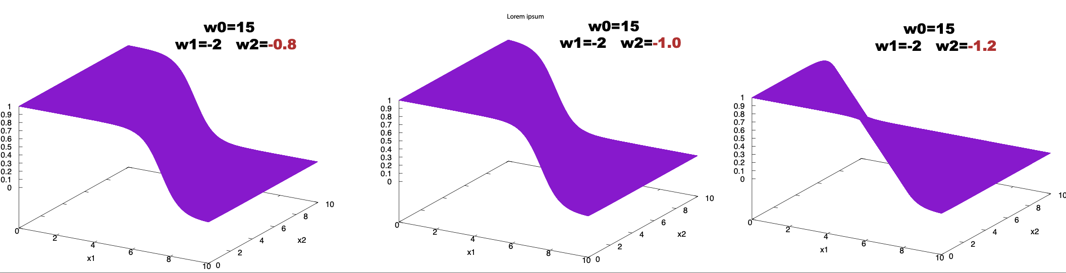 \[y = \frac{1}{1+ e^{-(w_0 + w_1 x_1 + w_2 x_2)}}\]and we can plot it as a function of the inputs as in Figure 3.