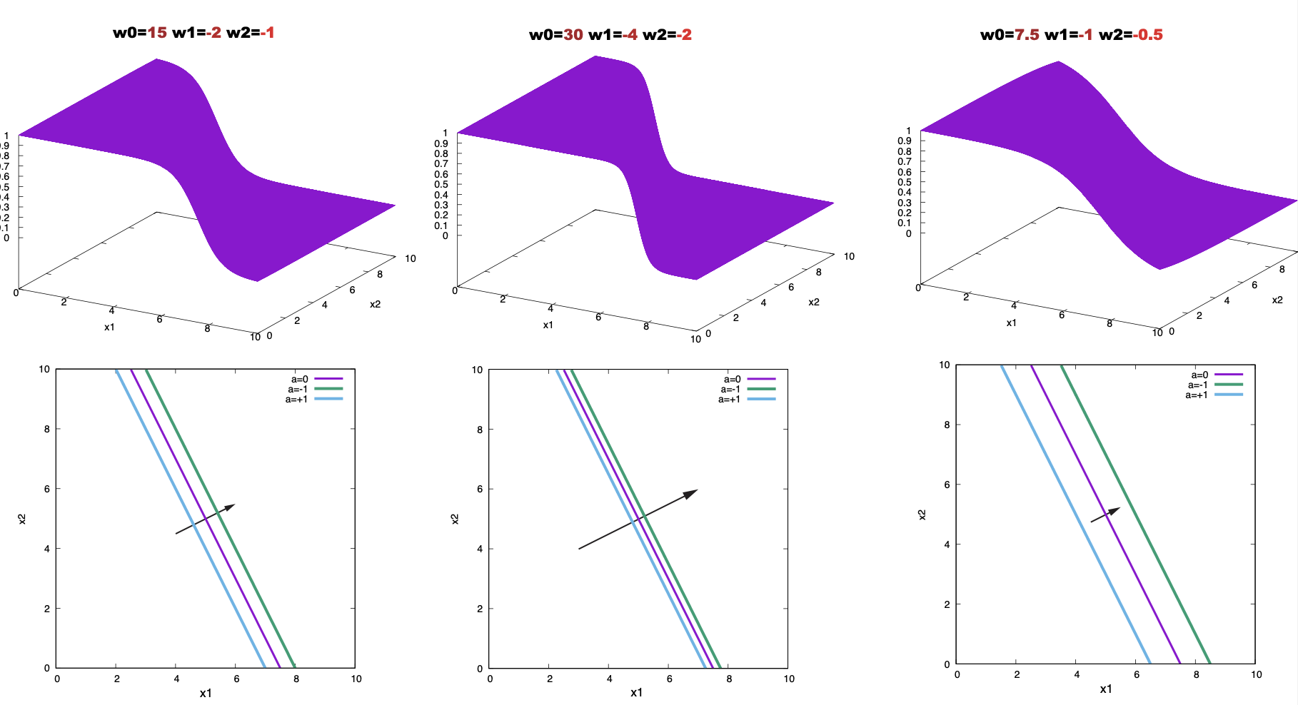 Figure 7. Effect on neuron activity of scaling the weights. The contours correspond to the values a = 0.0, 1, and -1. Arrows point in the direction of the weight vector.