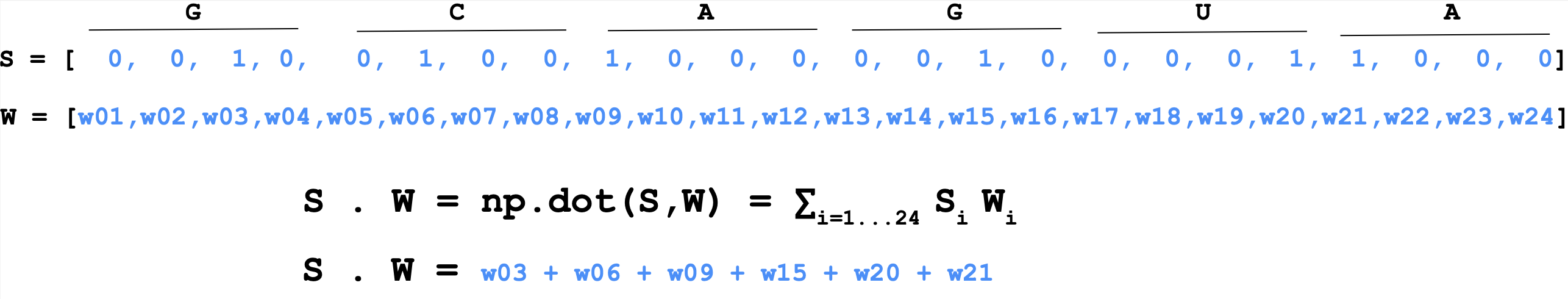 \[S\cdot W = \mbox{np.dot}(S,W) = \sum_{i=1} ^{i=4\times L} S_i W_i\]