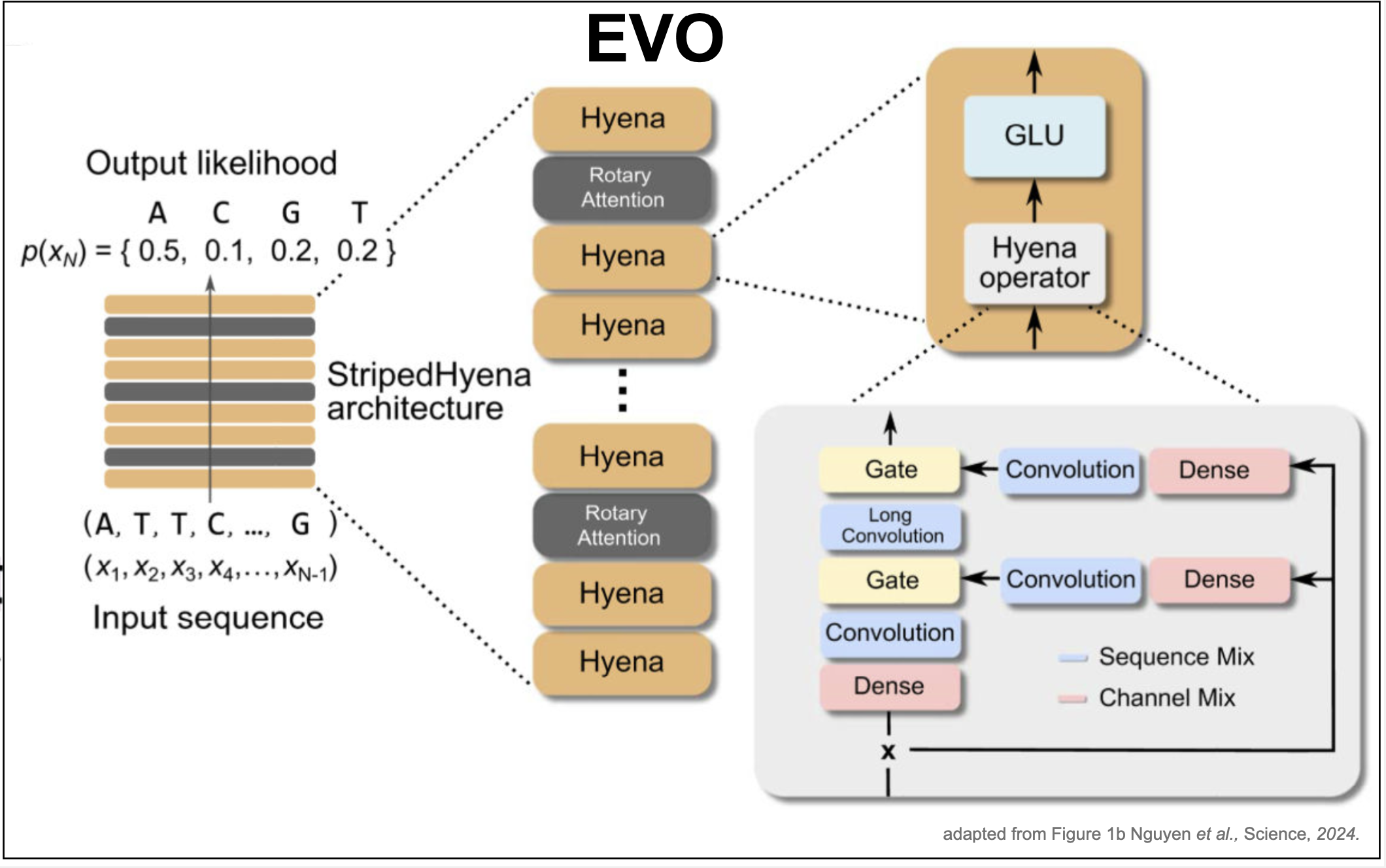 Evo is a decoder that given a genomic sequence \(x_1\ldots x_N\), predicts the probability of the next nucleotide \(P(x_{N+1}\mid x_1\ldots x_N)\) by means of a neural network. The Evo architecture consists not just of transformers. In Evo, transformer layers are interspearsed with a different architecture named the StripedHyena architecture as depicted in Figure 8.