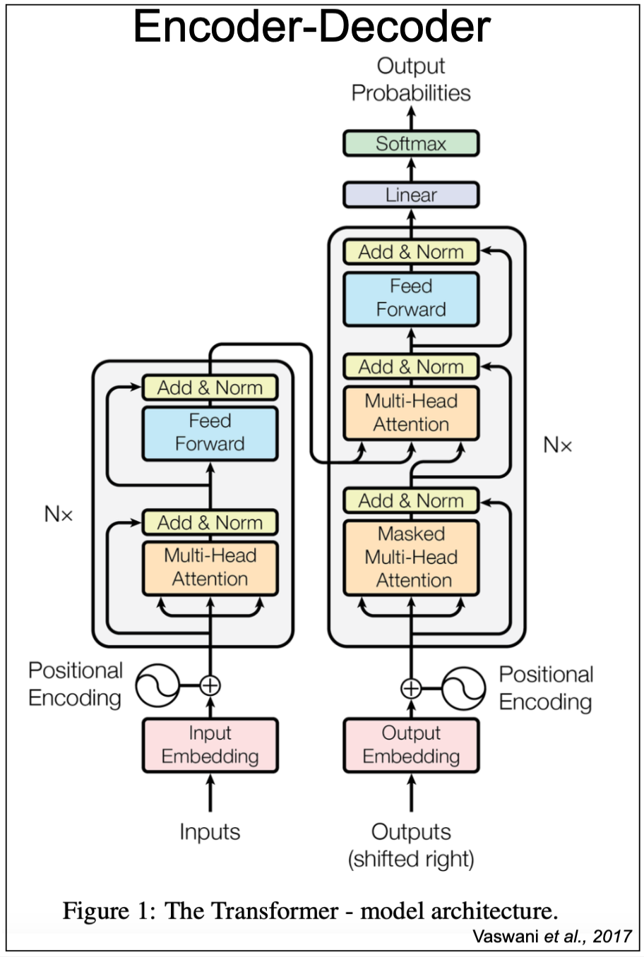 encoder-decoder. An encoder-decoder is used for sequence to sequence tasks where a sequence is transformed into a different one (for example in translation). The sequence-to-sequence transformer of “attention is all you need” is an example of an encoder-decoder.