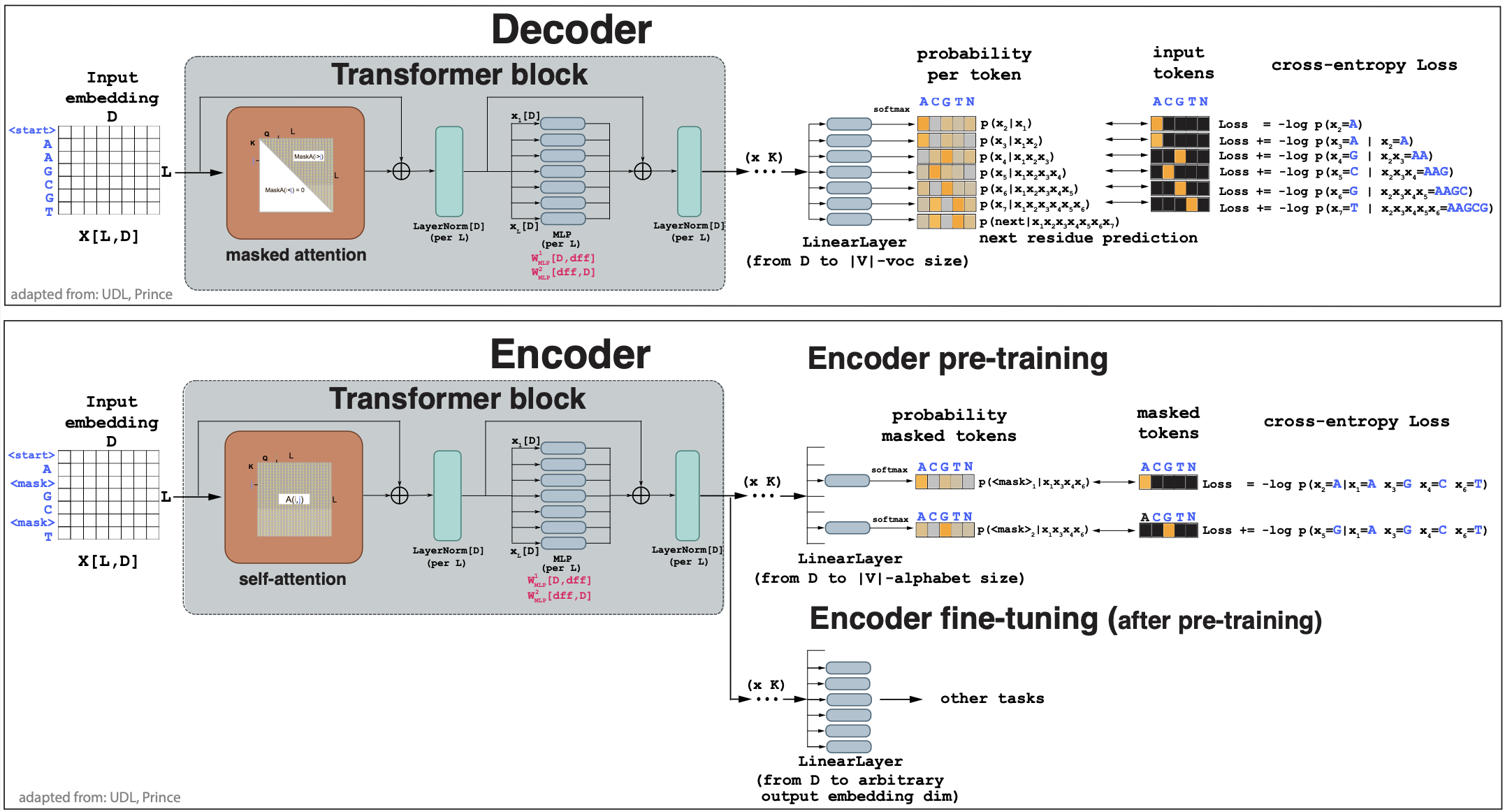 Figure 2. (A) A decoder network. Input is an embedding for a DNA sequence, output is a probability for each residue based on all residues before. (B) An encoder network. Input is an embedding for a DNA sequence with masked residues, output is a probability for the masked residues.