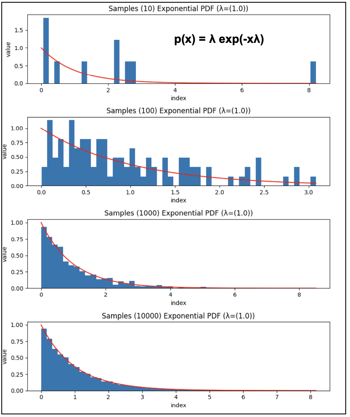 Figure 1. Samples 10, 100, 1000, 10000 from the exponential distribution with lambda = 1.0