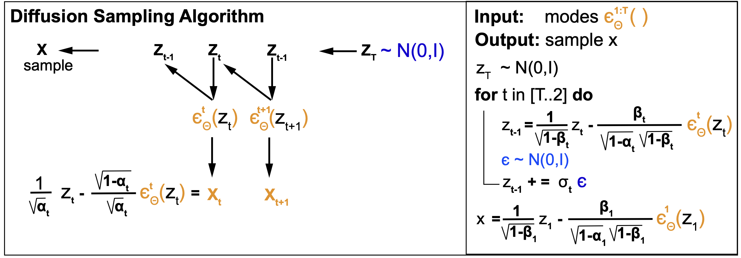 \[q(z_{t-1}\mid z_t)\]is the quantity that we would like to use to de-noise the process and generate new images or structures, however this “posterior” distribution is in most cases intractable. The reason is that it