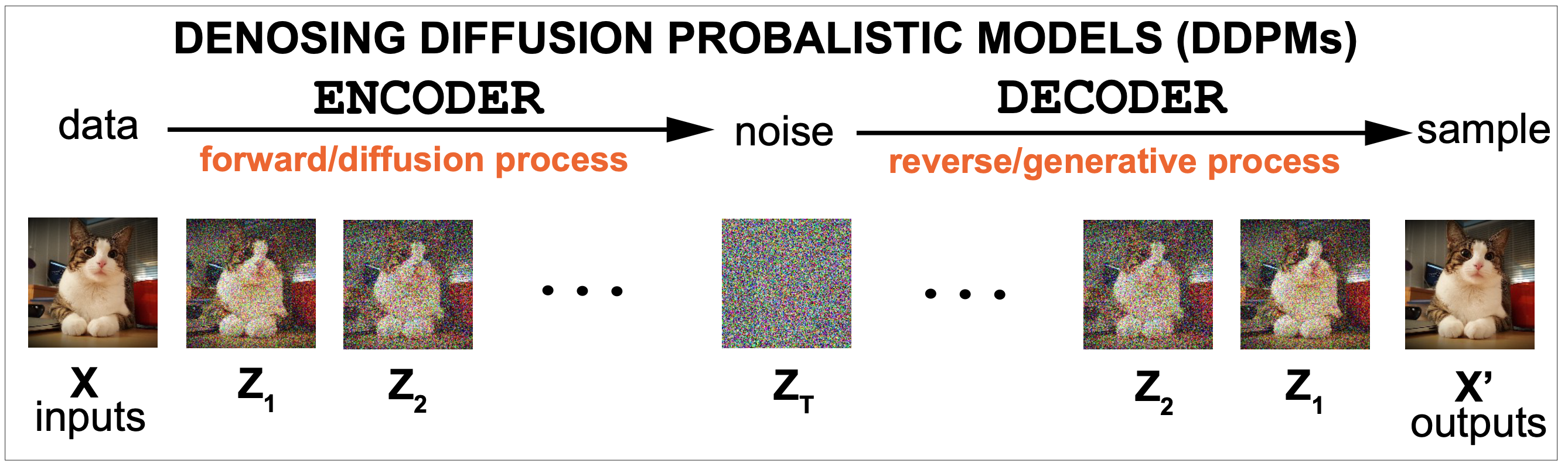In a denoising diffusion model there is an encoder and a decoder. Figure 1 shows a high level description of a diffusion model. It consists of two parts: an encoder that introduces noise into the data, and a decoder that reverses the process to provide a probability distribution that allows to sample new examples from an approximation to the probability of the data. The encoder takes data \(x\), and transforms it in a series of successive steps \(z_1, \ldots z_T\) into noise data. The decoder then reverses the process one-by-one \(z_T, z_{T-1},\ldots z_1\) until it reproduces the input data \(x\).